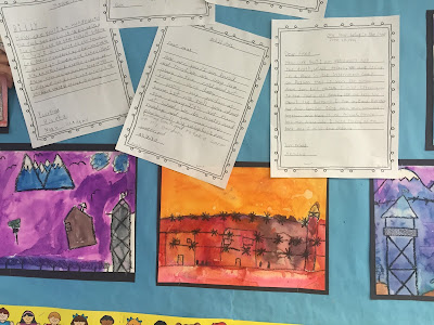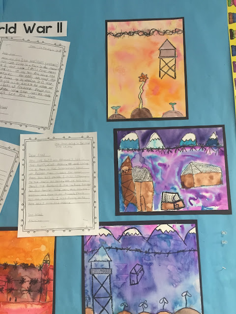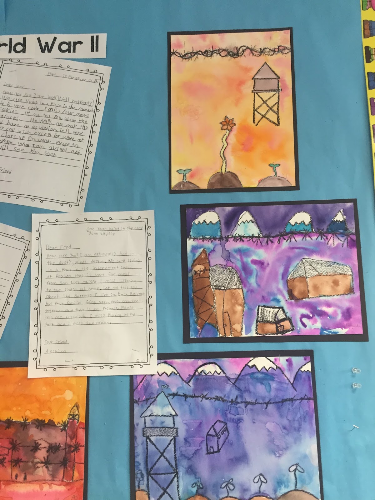 | Students wrote letters from the point of view of a child at an interment camp, and created art depicting cold mountain regions, or deserts where the camps were located. |