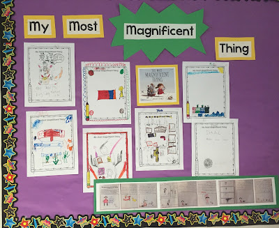 These students are in 4th-6th grade. They completed the summary frame in their own words and illustrated it. Then they drew their own Magnificent Things! At the bottom of our bulletin board are pages from several different students' journals which I put together to tell the story. So proud of these learners!